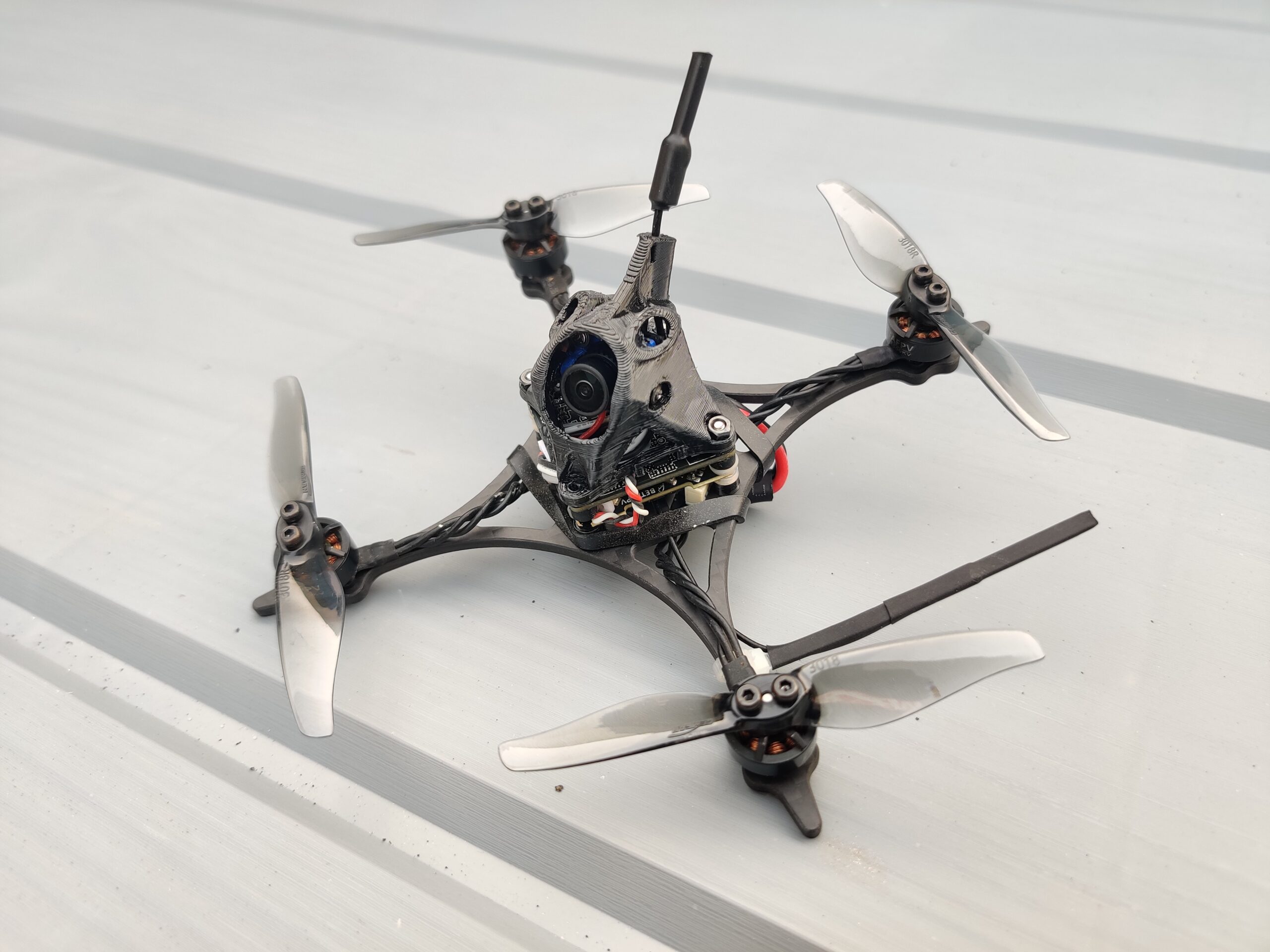 Du coup, cherchant l’adéquation hélices moteur, j’ai fini par utiliser des Gemfan 3018 bipales, montant ainsi à.. 3 pouces ! Donc au final, une bouille marrante, et une poussée respectable, en face d’un poids de quelques 110 g en ordre de vol, ça devenait sacrément fun… une belle trouvaille, quoi !